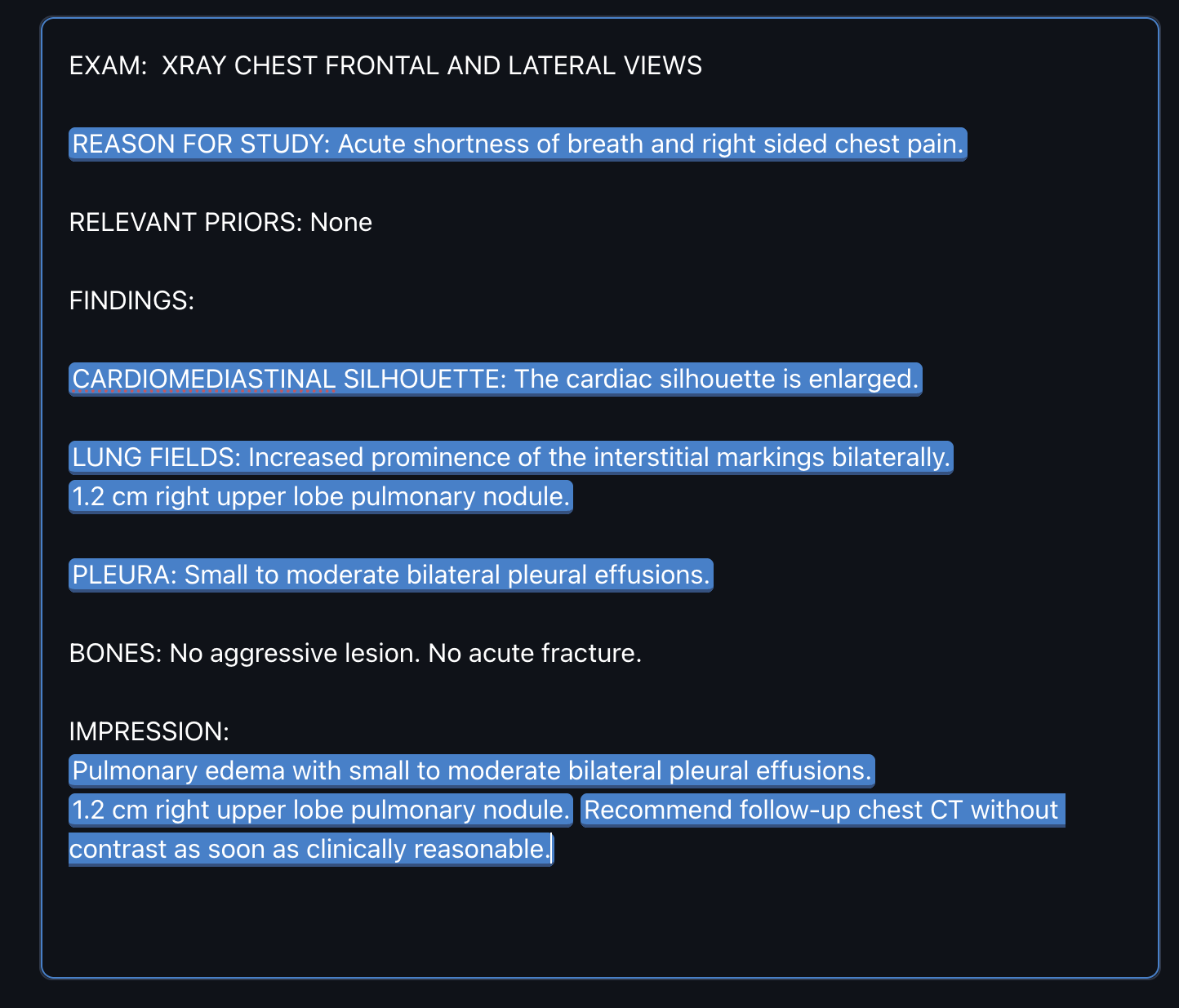 Our augmented reporting drastically cuts report creation time and cognitive load, enabling radiologists to interpret more exams per shift without increased stress, directly boosting productivity and earnings. Fewer clinician callbacks from perfectly edited reports mean less wasted time, while automated follow-up tracking reduces medical risks and ensures no patients slip through the cracks, enhancing practice efficiency and revenue potential.